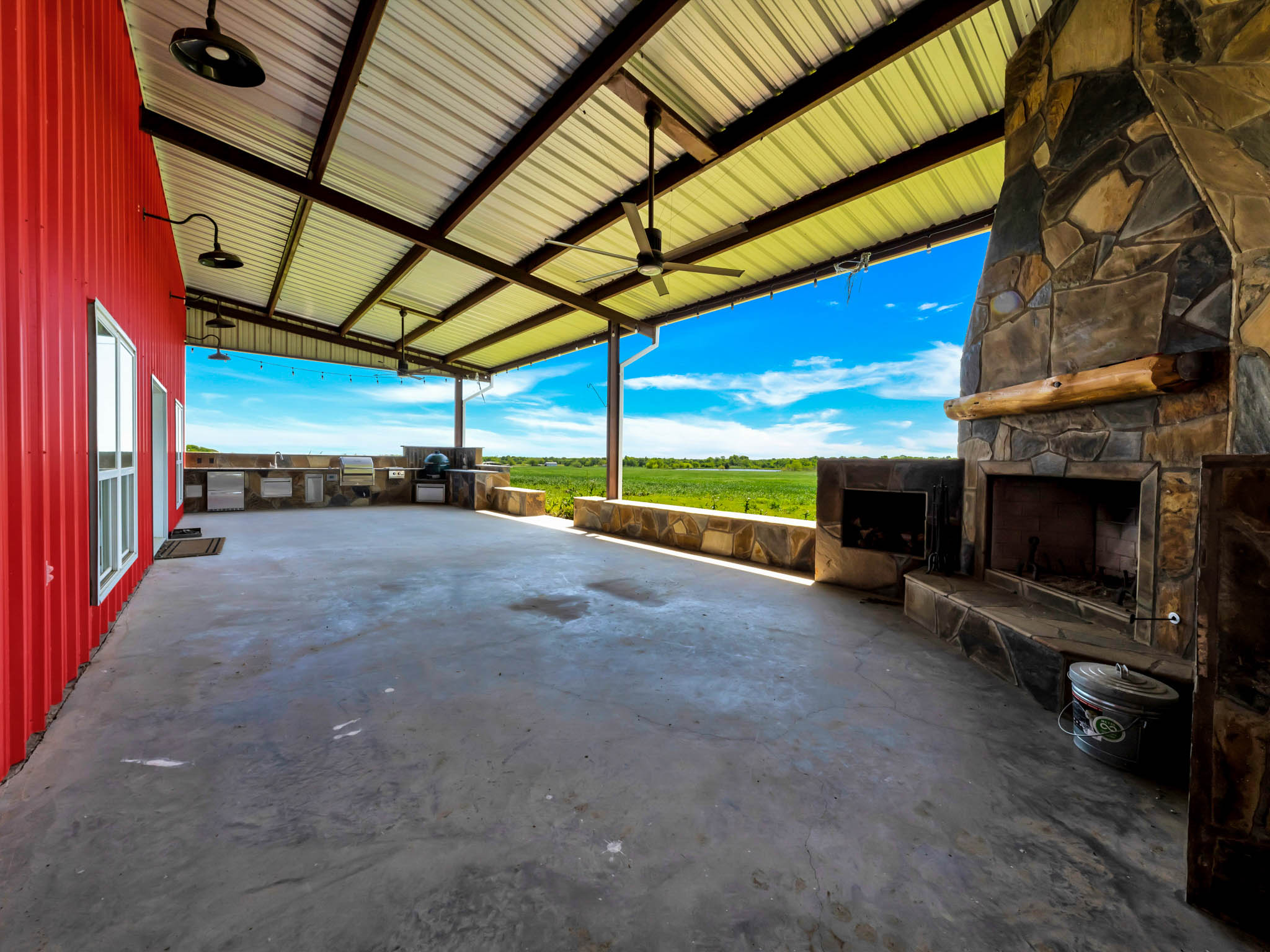 Along the Northern exposure of the residence, there is a fully equipped outdoor kitchen and covered patio. The outdoor kitchen has built in refrigerator, gas grill and a large ceramic smoker. Adjacent to the outdoor kitchen is a large custom built stone fireplace to relax or gather friends and family.